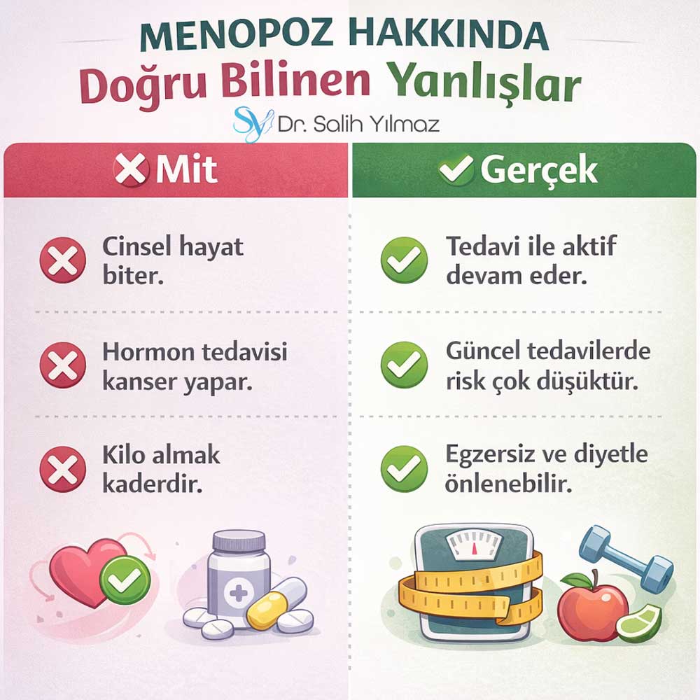 | "Hormon tedavisi kesinlikle kanser yapar." | Eski veriler hatalı yorumlandı. Güncel, biyoeşdeğer tedavilerde ve doğru hasta seçiminde risk çok düşüktür ve yaşam kalitesini artırır. |