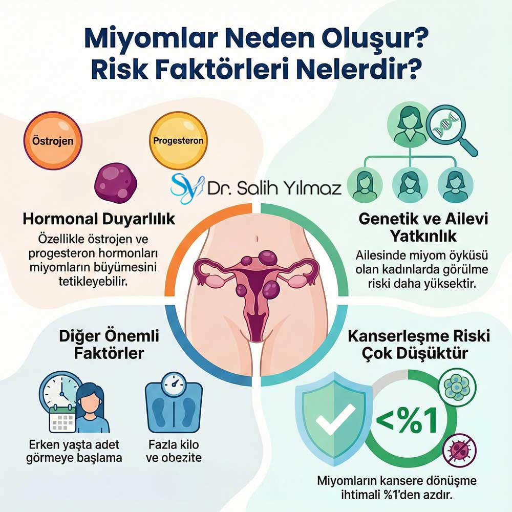 Miyomlar, rahmin kas tabakasında gelişen iyi huylu tümörlerdir ve üreme çağındaki kadınların büyük bir kısmında görülür. Çoğu miyom belirti vermez ve rutin kontroller sırasında yakalanır. Ancak bazı miyomlar adet düzensizliği, kansızlık, ağrı, kısırlık veya gebelik problemlerine yol açabilir.